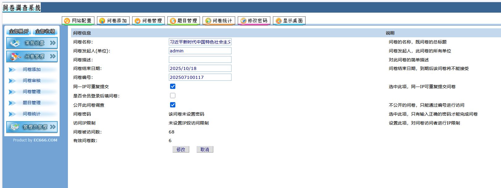 | 企成在线问卷调查系统 | 问卷管理 | 创建、编辑、删除问卷,设置问卷有效期和访问权限 |